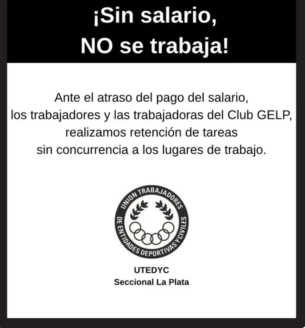 Los problemas de pagos en Gimnasia no son nuevos. Semanas atrás, los trabajadores de UTEDYC realizaron una retención de tareas: algunos empleados directamente no asistieron a sus puestos y otros lo hicieron sin realizar funciones. En los últimos días, el club abonó una parte de lo adeudado, pero no alcanzó para calmar las tensiones.