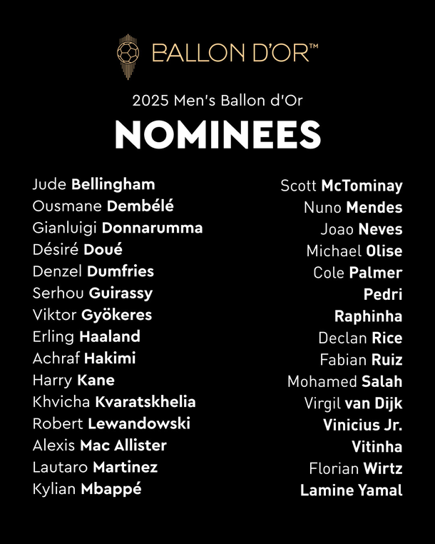 Los nominados al Balón de Oro 2025 masculino Alexis Mac Allister (Liverpool – Argentina) Lautaro Martínez (Inter Milan – Argentina) Ousmane Dembélé (París Saint Germain – Francia) Gianluigi Donnarumma (París Saint Germain – Italia) Jude Bellingham (Real Madrid – Inglaterra) Désiré Doué (París Saint Germain – Francia) Denzel Dumfries (Inter Milan – Países Bajos) Serhou Guirassy (Borussia Dortmund – Guinea) Erling Haaland (Manchester City – Noruega) Viktor Gyökeres (Sporting Lisboa / Arsenal – Suecia) Achraf Hakimi (París Saint Germain – Marruecos) Harry Kane (Bayern Münich – Inglaterra) Scott McTominay (Napoli – Escocia) Kylian Mbappé (Real Madrid – Francia) Nuno Mendes (París Saint Germain – Portugal) João Neves (París Saint Germain – Portugal) Pedri (FC Barcelona – España) Cole Palmer (Chelsea – Inglaterra) Michael Olisé (Bayern Münich – Francia) Raphinha (FC Barcelona – Brasil) Declan Rice (Arsenal – Inglaterra) Fabián Ruiz (París Saint Germain – España) Virgil van Dijk (Liverpool – Países Bajos) Vinícius Jr. (Real Madrid – Brasil) Mohamed Salah (Liverpool – Egipto) Florian Wirtz (Bayer Leverkusen / Liverpool – Alemania) Vitinha (París Saint Germain – Portugal) Lamine Yamal (FC Barcelona – España) Robert Lewandowski (FC Barcelona – Polonia) Khvicha Kvaratskhelia (París Saint Germain – Georgia)