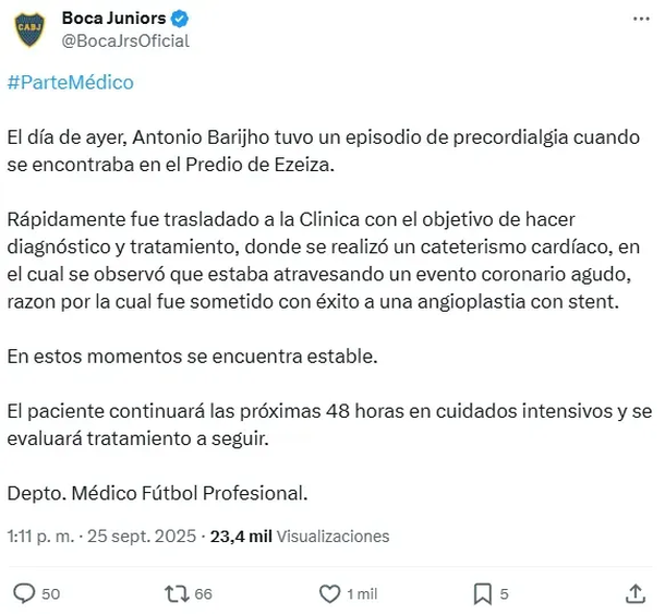 Menos de 24 horas después, el Departamento Médico del Fútbol Profesional del Xeneize difundió un parte oficial detallando su estado y los procedimientos realizados. Según el comunicado del club, sufrió un episodio de precordialgia que derivó en la detección de un “evento coronario agudo” mediante estudios clínicos y un cateterismo cardíaco.