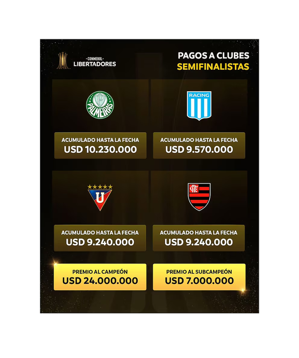La Confederación Sudamericana de Fútbol (Conmebol) publicó los impresionantes premios que alcanzaron los clubes que llegaron a las semifinales de las copas continentales. En la…