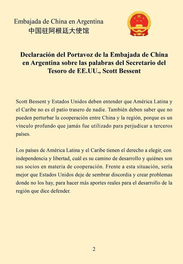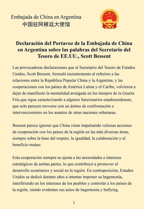 Nacionales Comunicado de la Embajada de China en Argentina tras el acuerdo con EE.UU.: “Patio trasero” Admin Oct 11, 2025 0 embajada china argentina1 embajada china argentina3 NOTA EN DESARROLLO