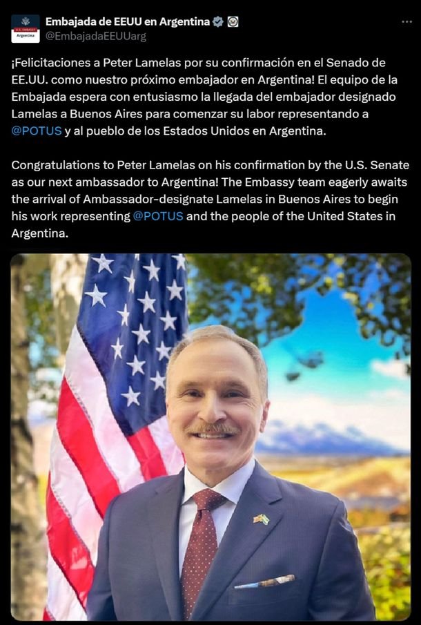 “¡Felicitaciones a Peter Lamelas por su confirmación en el Senado de EE.UU. como nuestro próximo embajador en Argentina! El equipo de la Embajada espera con entusiasmo la llegada del embajador designado Lamelas a Buenos Aires para comenzar su labor representando a Donadl Trump (@POTUS) y al pueblo de los Estados Unidos en Argentina”, anunciaron desde la cuenta oficial de la embajada de los Estados Unidos.