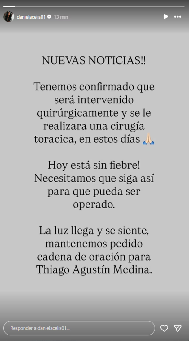 “Nuevas noticias. Tenemos confirmado que será intervenido quirúrgicamente y se le realizará una cirugía torácica, en estos días”, comenzó diciendo Celis, y añadió: “Hoy está sin fiebre. Necesitamos que siga así para que pueda ser operado”. Al cierre de su mensaje, volvió a hacer un pedido habitual tanto de su parte como del entorno de Medina: “La luz llega y se siente, mantenemos la solicitud de la cadena de oración para Thiago”.
