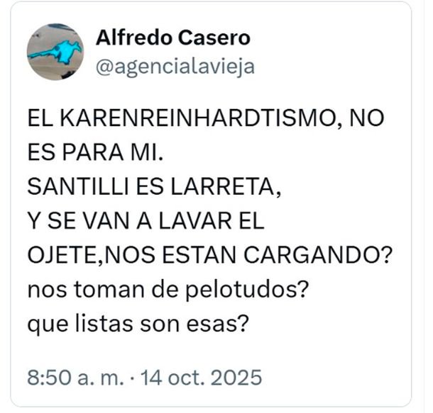 Nacionales Duro posteo de Alfredo Casero contra la lista de LLA en Provincia: “¿Nos toman de pelotudos?” Admin Oct 14, 2025 0 tuit casero NOTA EN DESARROLLO
