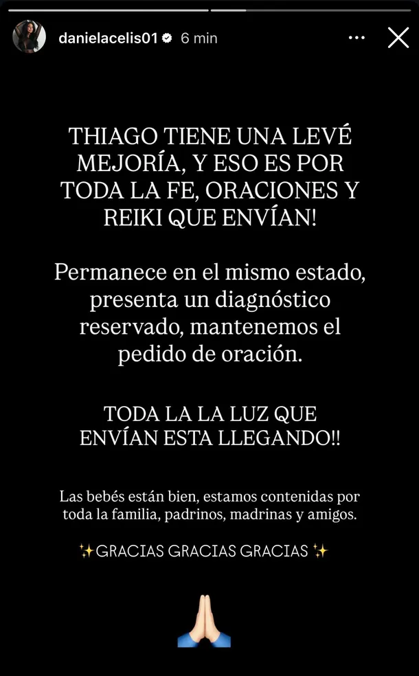 Fue a través de una historia de Instagram donde la también exparticipante del reality de Telefe indicó que “Thiago tiene una leve mejoría”, que atribuyó a “toda la fe, oraciones y reiki” que le mandan sus seguidores y allegados. “Permanece en el mismo estado, presenta un diagnóstico reservado, mantenemos el pedido de oración”, agregó la mediática, y expresó: “Toda la luz que envían está llegando”.