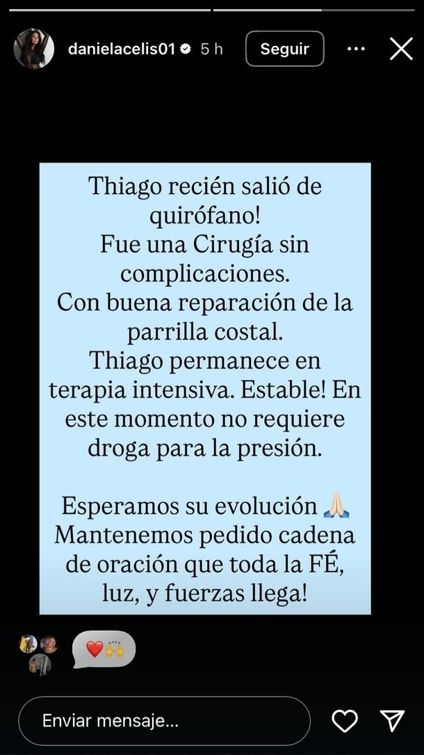 “¡Thiago recién salió de quirófano! Fue una cirugía sin complicaciones. Con buena reparación de la parrilla costal. Thiago permanece en terapia intensiva. ¡Estable!”, escribió en Instagram, llevando algo de tranquilidad a sus seguidores, aunque todavía no se había revelado el parte médico oficial.