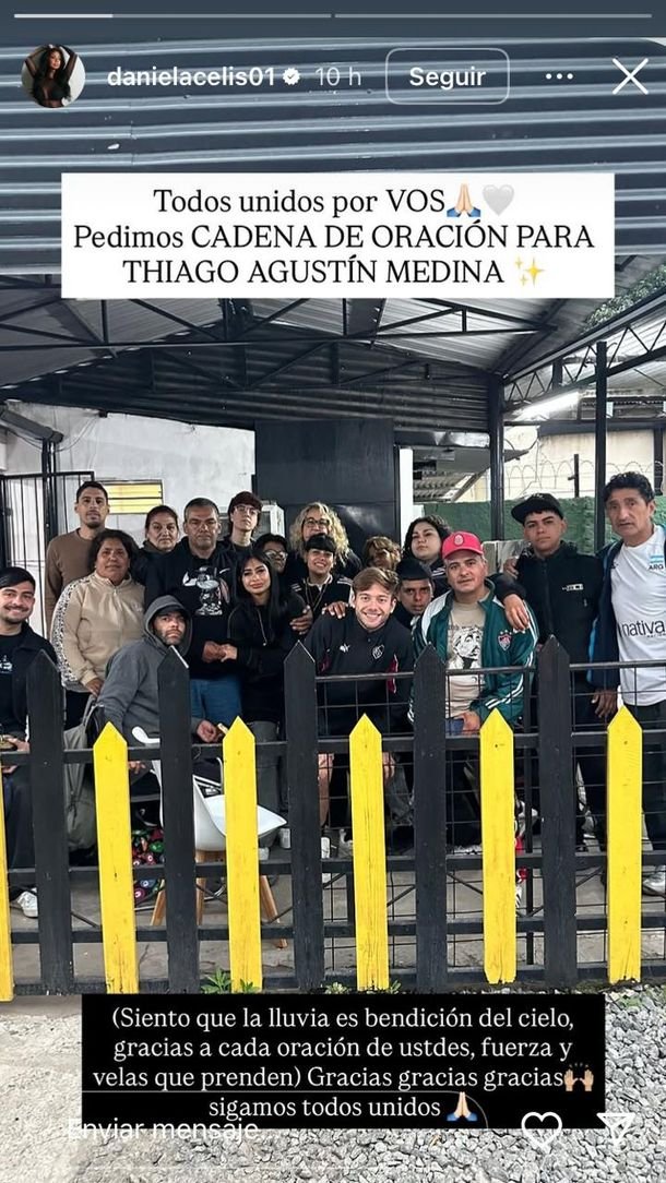 En otra historia de esa misma red social, agregó una foto donde se puede ver a familiares y amigos del ex Gran Hermano, que día a día montan guardia en la puerta del centro médico con la esperanza de tener novedades del joven: “Todos unidos por vos. Pedimos cadena de oración para Thiago Agustín Medina”, escribió la expareja del accidentado, en una foto donde también aparece Nacho Castañares, otro exconcursante del reality show que mantiene una estrecha amistad con ambos.