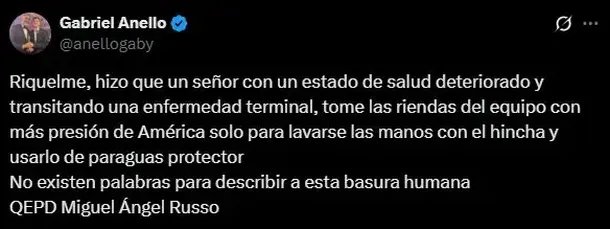 Y agregó: “No existen palabras para describir a esta basura humana. QEPD Miguel Ángel Russo“, cerró Anello.