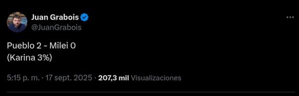 El dirigente social Juan Grabois fue bastante más escueto en su mensaje, que no por ello dejó de ser celebratorio al final de una jornada decisiva para la salud y educación públicas: “Pueblo 2 – Milei 0 (Karina 3%)”, ironizó el referente de Patria Grande, que es candidato a diputado nacional por Fuerza Patria para las elecciones legislativas del 26 de octubre.
