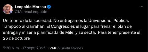 “No entregamos la Universidad Pública. Tampoco al Garrahan. El Congreso es el lugar para frenar el plan de entrega y miseria planificada de (Javier) Milei y su secta. Para tener presente el 26 de octubre”, sentenció.