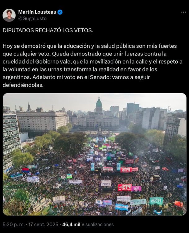 El senador y presidente de la Unión Cívica Radical (UCR), Martín Lousteau, indicó que este miércoles quedó demostrado que “la educación y la salud pública son más fuertes que cualquier veto”.