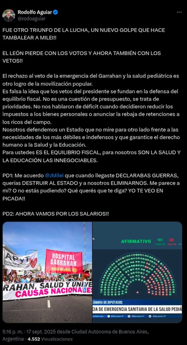 “El rechazo al veto de la emergencia del Garrahan y la salud pediátrica es otro logro de la movilización popular. Es falsa la idea que los vetos del Presidente se fundan en la defensa del equilibrio fiscal”, señaló el titular de ATE en un extenso mensaje en el que convino además que “el león pierde con los votos y ahora también con los vetos”, en referencia a la ya casi olvidada caricatura de Javier Milei.