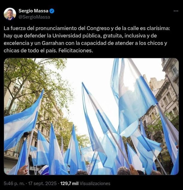 Por ejemplo, el referente del Frente Renovador, Sergio Massa, remarcó en X que “la fuerza del pronunciamiento del Congreso y de la calle es clarísima: hay que defender la Universidad pública, gratuita, inclusiva y de excelencia y un Garrahan con la capacidad de atender a los chicos y chicas de todo el país”.