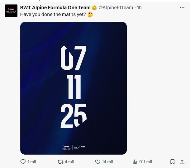 Finalmente, fue el propio equipo el que también hizo un posteo en la misma red social con la fecha de inicio de las actividades en Interlagos cuya suma da el número deseado y la pregunta: “¿Ya hiciste los cálculos?”.