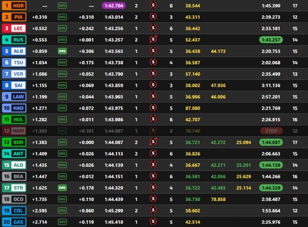Así está el campeonato de Pilotos de la F1: Oscar Piastri (McLaren): 324 puntos Lando Norris (McLaren): 293 puntos Max Verstappen (Red Bull): 230 puntos George Russell (Mercedes): 194 puntos Charles Leclerc (Ferrari): 163 puntos Lewis Hamilton (Ferrari): 117 puntos Alexander Albon (Williams): 70 puntos Andrea Kimi Antonelli (Mercedes): 66 puntos Isack Hadjar (Racing Bulls): 38 puntos Nico Hülkenberg (Sauber): 37 puntos Lance Stroll (Aston Martin): 32 puntos Fernando Alonso (Aston Martin): 30 puntos Esteban Ocon (Haas): 28 puntos Pierre Gasly (Alpine): 20 puntos Liam Lawson (Racing Bulls): 20 puntos Gabriel Bortoleto (Sauber): 18 puntos Oliver Bearman (Haas): 16 puntos Carlos Sainz (Williams): 16 puntos Yuki Tsunoda (Red Bull): 12 puntos Franco Colapinto (Alpine): 0 puntos Jack Doohan (Alpine)*: 0 puntos