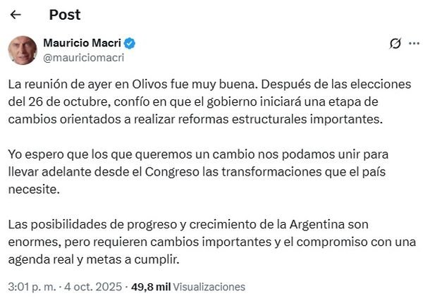 Nacionales Mauricio Macri le reclamó al Gobierno cambios para después de las elecciones Admin Oct 4, 2025
