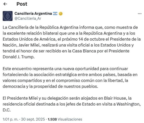 “La Cancillería de la República Argentina informa que, como muestra de la excelente relación bilateral que une a la República Argentina y a los Estados Unidos de América, el próximo 14 de octubre el Presidente de la Nación, Javier Milei, realizará una visita oficial a los Estados Unidos y tendrá el honor de ser recibido en la Casa Blanca por el Presidente Donald J. Trump”, informó el Ministerio de Relaciones Exteriores a través de su cuenta oficial de X.