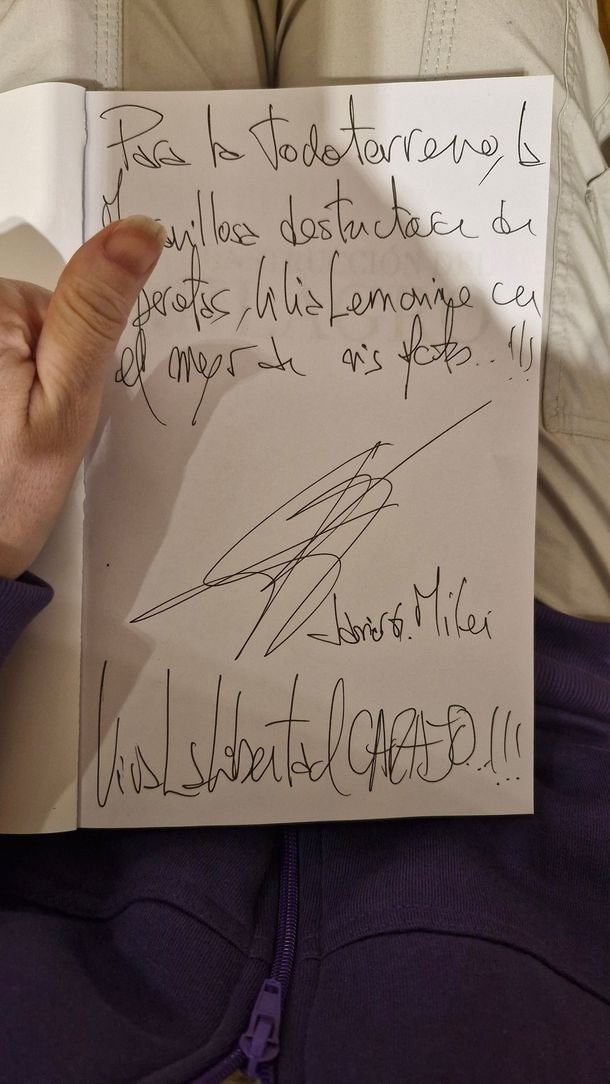 Por su parte, Milei realizó un dedicatoria personalizada para su maquilladora personal: “Para la todo terreno, la maravillosa destructora de operetas, Lilia Lemoine, con el mayor de mis afectos. ¡Viva la Libertad, carajo!”, expresó.