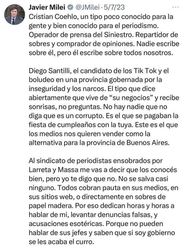 “Ya tengo mi copia del nuevo libro de @JMilei, con super dedicatoria! El lunes tendré el honor de compartir el escenario con el mejor presidente del mundo, que además es una mezcla de Elvis con Wolverine… punk”, escribió la legisladora, junto a fotos del regalo y del mensaje del mandatario, en la previa de la presentación.