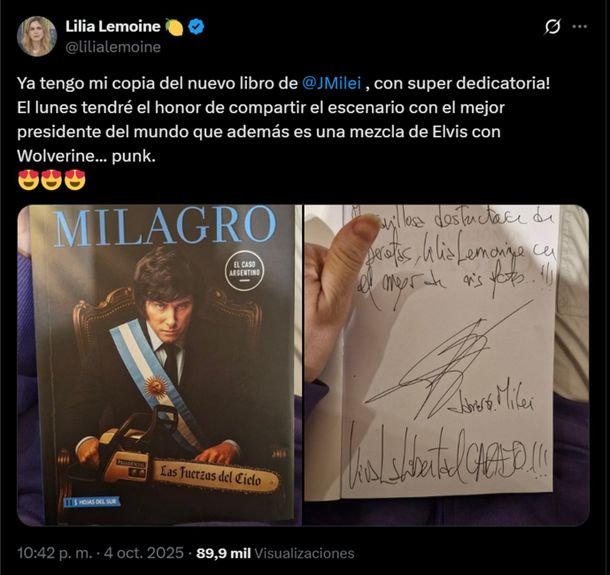 La diputada Lilia Lemoine publicó en su cuenta de X que recibió un ejemplar del nuevo libro del presidente Javier Milei, “La construcción del milagro”, acompañado de una sentida dedicatoria.
