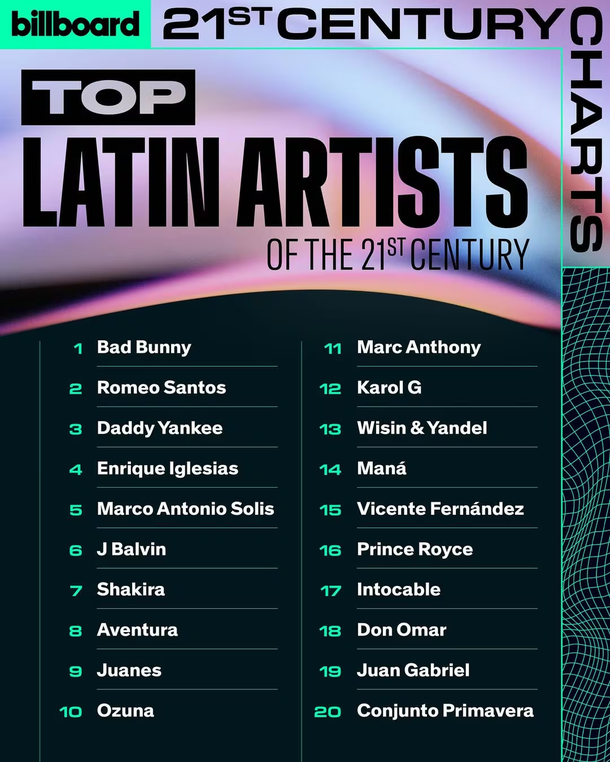 La lista completa de Billboard: el top 100 Latin Artists of the 21st Century Bad Bunny Romeo Santos Daddy Yankee Enrique Iglesias Marco Antonio Solís J Balvin Shakira Aventura Juanes Ozuna Marc Anthony Karol G Wisin & Yandel Maná Vicente Fernández Prince Royce Intocable Don Omar Juan Gabriel Conjunto Primavera Peso Pluma Banda El Recodo De Cruz Lizárraga Los Temerarios Joan Sebastian La Arrolladora Banda El Limón De René Camacho Maluma Luis Fonsi Chayanne Nicky Jam Los Tigres Del Norte Banda MS De Sergio Lizárraga Ricardo Arjona Alejandro Fernández Fuerza Regida Jenni Rivera Rauw Alejandro Cristian Castro Gerardo Ortiz Paulina Rubio Anuel AA Ricky Martin Selena Farruko Luis Miguel Grupo Montéz De Durango Julión Álvarez Y Su Norteño Banda Tito “El Bambino” Calibre 50 Thalía Carlos Vives Juan Luis Guerra 440 Camila Alejandro Sanz RBD Los Tucanes De Tijuana Los Bukis Pitbull Espinoza Paz El Trono De México Pepe Aguilar Alexandre Pires David Bisbal Jennifer Peña Patrulla 81 Gloria Estefan K-Paz De La Sierra Flex Banda Los Recoditos A.B. Quintanilla III Feid Los Rieleros Del Norte Ivan Cornejo Alacranes Musical Los Huracanes Del Norte Voz De Mando Sech Kali Uchis Los Ángeles Azules Los Horóscopos De Durango Palomo Alexandre Pires David Bisbal Jennifer Peña Patrulla 81 Gloria Estefan K-PAZ de la Sierra Flex Banda Los Recoditos A.B. Quintanilla III Feid Los Rieleros del Norte Ivan Cornejo Alacranes Musical Los Huracanes del Norte Voz de Mando Sech Kali Uchis Los Ángeles Azules Los Horóscopos de Durango Palomo