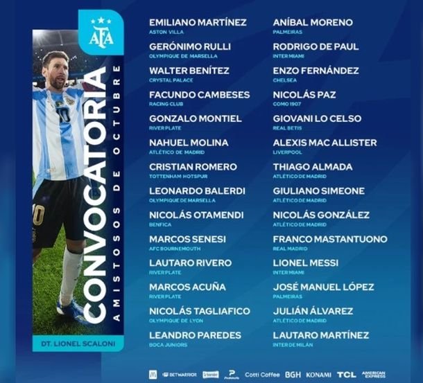 Además de los nuevos convocados, regresan Enzo Fernández, del Chelsea, y Marco Senesi, del Bournemouth, mientras que José López, la figura de Palmeiras, mantiene su lugar en el plantel.