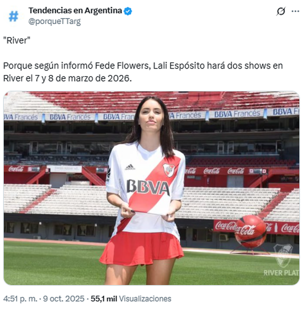 El periodista Fede Flowers lanzó una primicia e hizo estallar a los fans de Lali Espósito: según el comunicador, la intérprete de “Fanático” realizará dos shows en River en el año 2026 y, aunque todavía no se conocen mayores detalles, las fechas indicadas son el 7 y 8 de marzo.