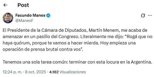 El diputado nacional Facundo Manes (Democracia para Siempre) denunció este miércoles en sus redes sociales al presidente de la Cámara, Martín Menem, por supuestas amenazas: “El Presidente de la Cámara de Diputados, Martín Menem, me acaba de amenazar en un pasillo del Congreso. Literalmente, me dijo: ‘Rogá que no haya quórum, porque te vamos a hacer mierda. Hoy empieza una operación de prensa brutal contra vos'”, escribió.