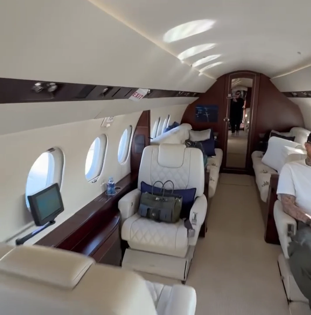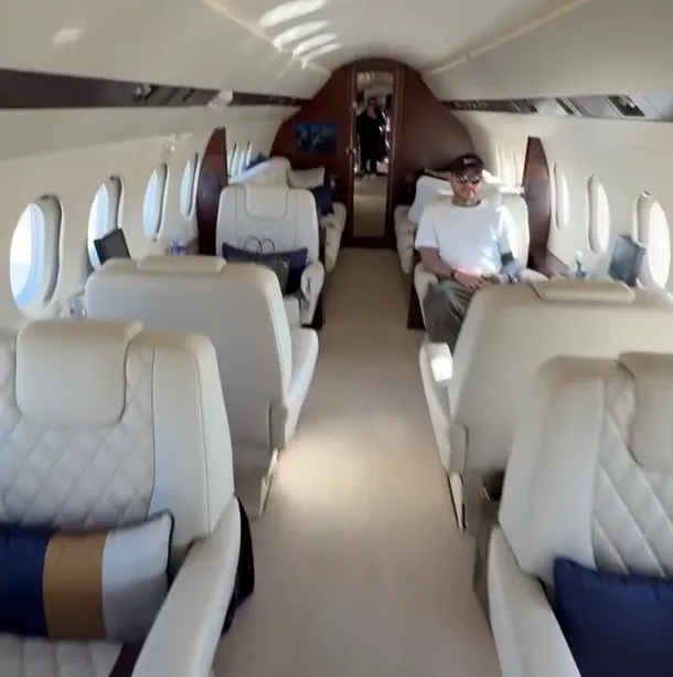 En el interior, las imágenes muestran un espacio amplio y elegante. Los asientos están tapizados en cuero blanco con costuras en rombo, distribuidos en pares enfrentados para facilitar la interacción durante el viaje. Cada butaca cuenta con reposabrazos, cinturones integrados y la posibilidad de reclinarse hasta convertirse en cama, ideal para trayectos prolongados. Sobre las mesas laterales se observan pantallas individuales, botellas de agua y bolsos de lujo, reforzando la estética premium del ambiente.