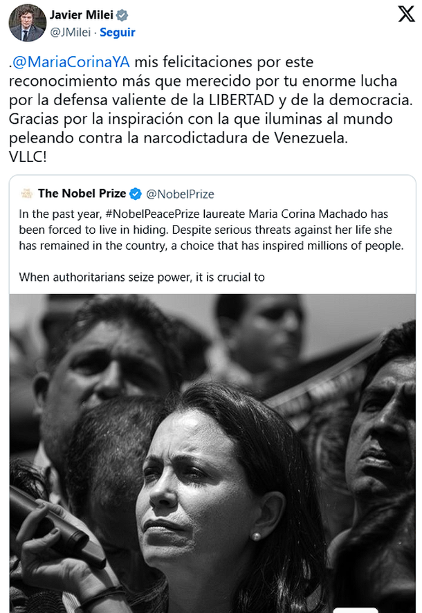 “Mis felicitaciones por este reconocimiento más que merecido por tu enorme lucha por la defensa valiente de la LIBERTAD y de la democracia”, escribió Milei, acompañando el mensaje con una foto de la dirigente venezolana. En su estilo habitual, el presidente añadió: “Gracias por la inspiración con la que iluminas al mundo peleando contra la narcodictadura de Venezuela. VLLC!”.