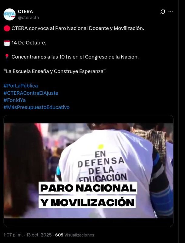 A través de su perfil de X la asociación gremial llamó en las últimas horas a una concentración frente al Congreso de la Nación a las 10 de la mañana del martes bajo el lema “La Escuela Enseña y Construye Esperanza”.
