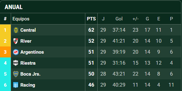 La otra opción es a través de la tabla anual. En este caso, La Banda tiene el segundo puesto, por detrás de Rosario Central que ya confirmó su boleto a la competencia más importante de Sudamérica.