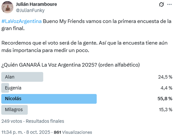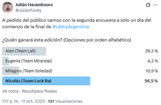 En este sentido, el periodista Julián Haramboure fue uno de los que decidió lanzar una encuesta en la red social X para dar un primer pantallazo de quién puede llegar a coronarse en esta edición del reality de talento. El primer sondeo dio como ganador a Nicolás Behringer, con un 55,8% de los votos, siguiéndole Alan Lez, con un 24,5%.