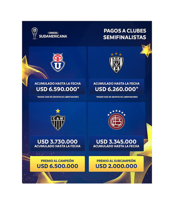 Por el lado de la Copa Sudamericana, los premios acumulados también alcanzan cifras importantes. Lanús lleva sumados 3.345.000 dólares, producto de su participación desde la fase de grupos y su avance hasta las semifinales.