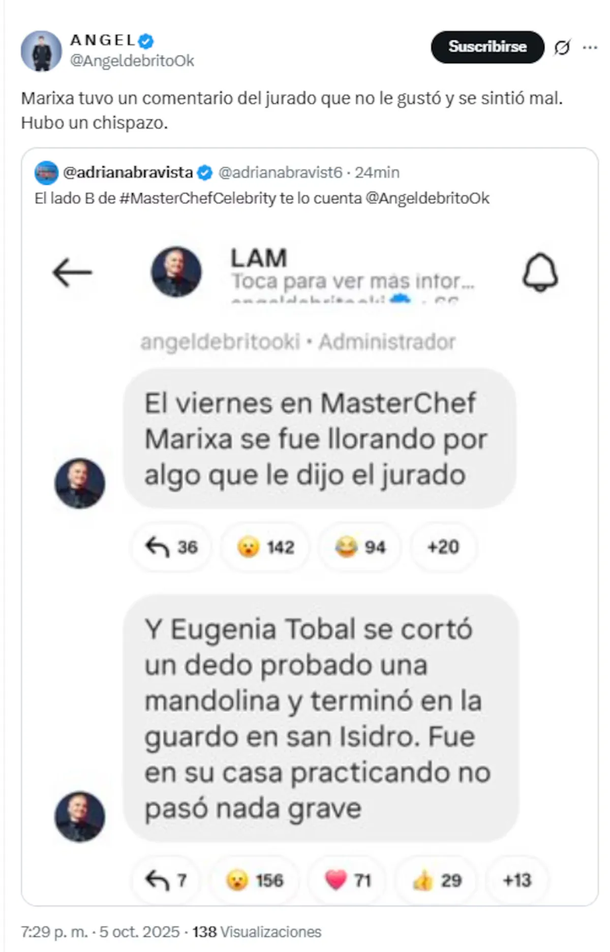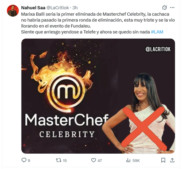 El dato fue revelado por el periodista Nahuel Saa, más conocido como La Criti, quien aseguró en su cuenta de X que Marixa Balli no habría superado la primera instancia de eliminación. “Marixa Balli sería la primera eliminada de MasterChef Celebrity”, escribió, despertando la reacción inmediata de los seguidores del reality.