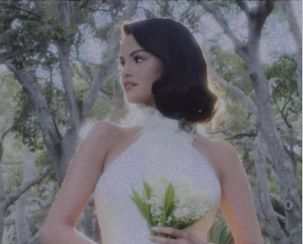 Para completar el look, Selena llevó unos pendientes de diamantes de Tiffany & Co., un peinado bob con ondas estilo Old Hollywood y un ramo de lirios del valle, una flor que simboliza la pureza. El maquillaje fue fiel a su estilo: piel luminosa y mejillas sonrojadas, probablemente gracias a su propia marca, Rare Beauty.