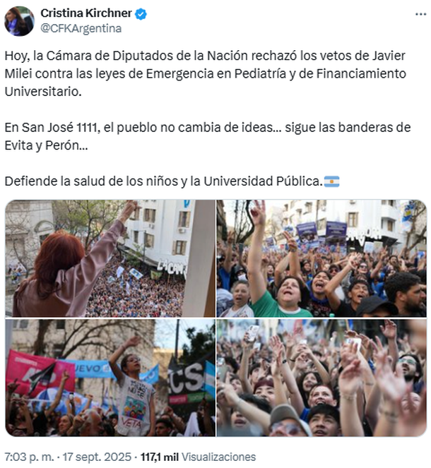 Desde su departamento, la exmandataria compartió sus sensaciones junto a algunas imágenes de los militantes, luego de que Diputados diera un doble revés al Gobierno: “Hoy, la Cámara de Diputados de la Nación rechazó los vetos de Javier Milei contra las leyes de Emergencia en Pediatría y de Financiamiento Universitario”, celebró la presidenta del Partido Justicialista (PJ).