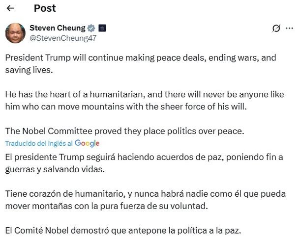 Por su parte, el director de comunicación de la Casa Blanca, Steven Cheung, posteó en X que el comité del Nobel probó que pone la política por encima de la paz”.